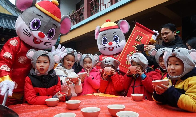 1月2日,小朋友在南京玄奘寺的赠粥送祝福活动现场喝腊八粥。 当日是农历腊月初八,中国传统腊八节。