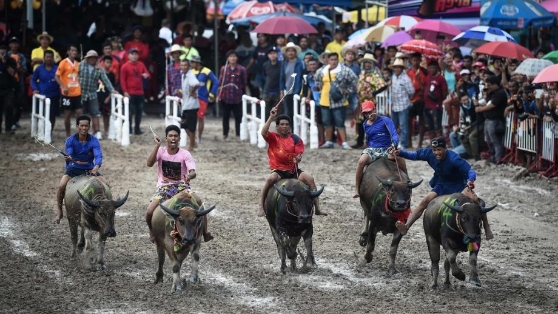 当地时间2019年10月12日,泰国春武里举行一年一度的水牛赛跑,选手骑牛狂奔。