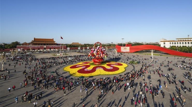 10月14日,以“花果篮”为主造型的天安门广场中心花坛吸引了众多游客参观拍照。“花果篮”的夜景更是流光溢彩,绚烂迷人。