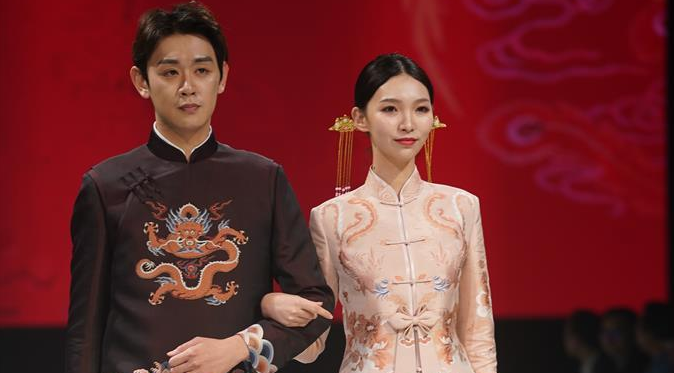 主题秀上展示大量带有龙凤、牡丹、海棠、彩蝶等中国传统文化元素的宋锦中式婚庆礼服。