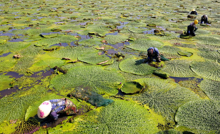 2019年8月19日,江苏省淮安市洪泽区岔河镇,种植户在采收芡实。