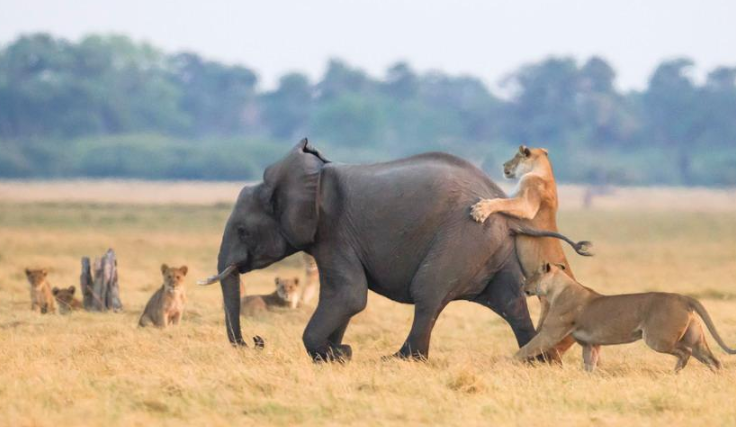 英国摄影师詹姆斯(James Gifford)在博茨瓦纳乔贝国家公园拍到一群狮子猎食大象的精彩画面。