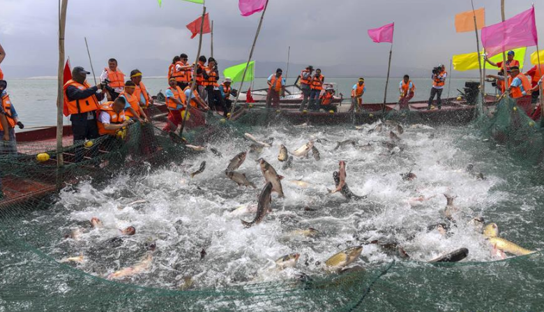 2019年7月9日,渔民们在江苏连云港沿海地区海边的滩涂上将刚收获的海蛏运送上岸装箱外运。