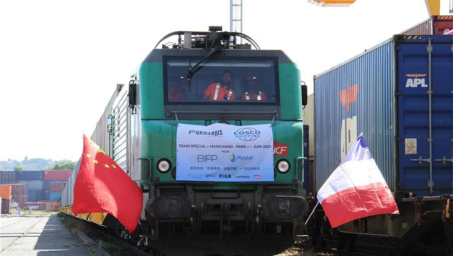 6月23日,满载防疫物资的中欧班列抵达法国巴黎东南郊的瓦朗通。
