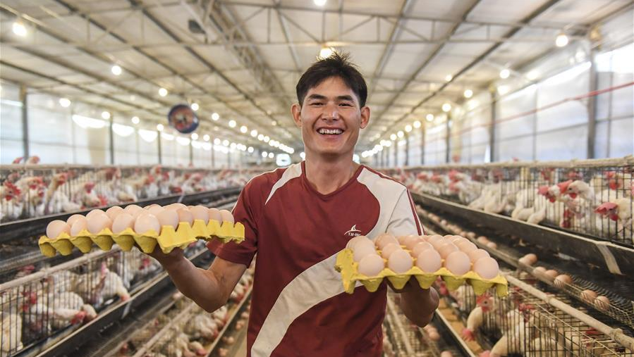 6月18日,覃永灵将饲料玉米投入拌料池中。