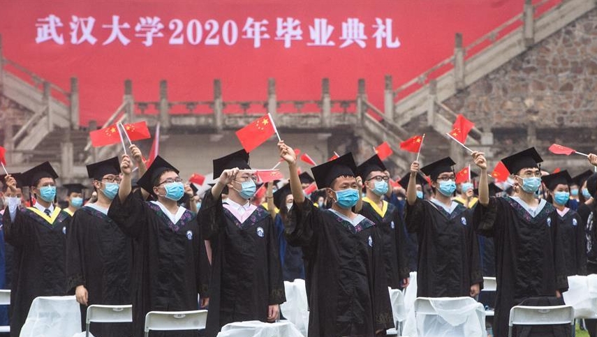 当日,武汉大学举办2020年毕业典礼,以毕业生线上参加为主,少量毕业生代表在学校操场参加。