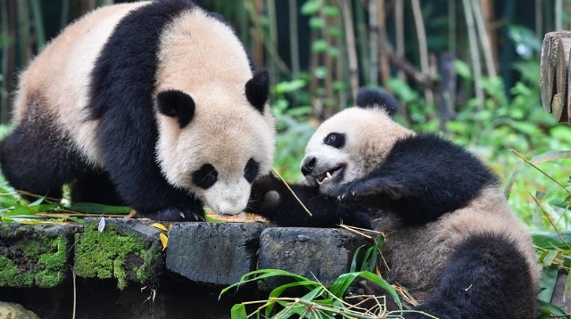 正在享受竹子大餐的广州长隆野生动物世界大熊猫婷仔被大熊猫隆仔抢食,两只大熊猫上演一场争食戏码。