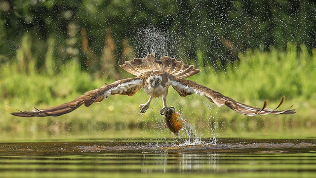 鱼鹰快速俯冲而下,掠过水面,鹰爪随即从水中成功抓起一条鱼儿,溅起水花,整个过程精彩诠释快准狠。