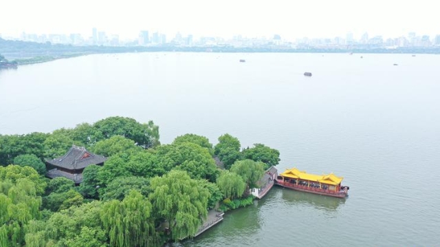 随着气温升高,杭州西湖绿意葱茏,展现出柔美的湖光山色。