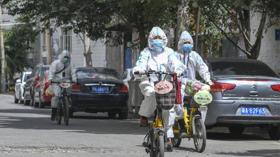 8月3日,在乌鲁木齐天山区西河坝前街社区,社区工作人员准备骑上”跑腿小车“为居民送去生活物品。