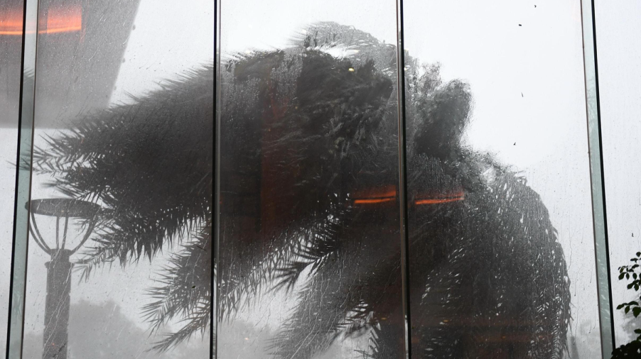 2020年8月4日,浙江乐清一酒店的景观树在台风中大幅摇动。