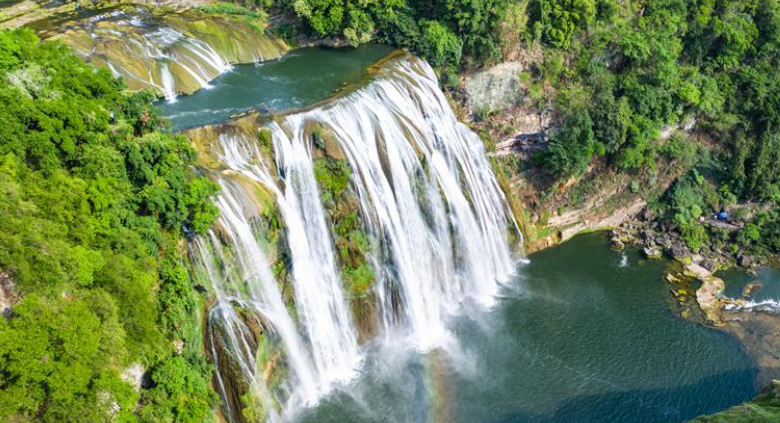 演员在苗族大型山水实景演出《西江盛典》中表演(7月30日摄,无人机照片)。