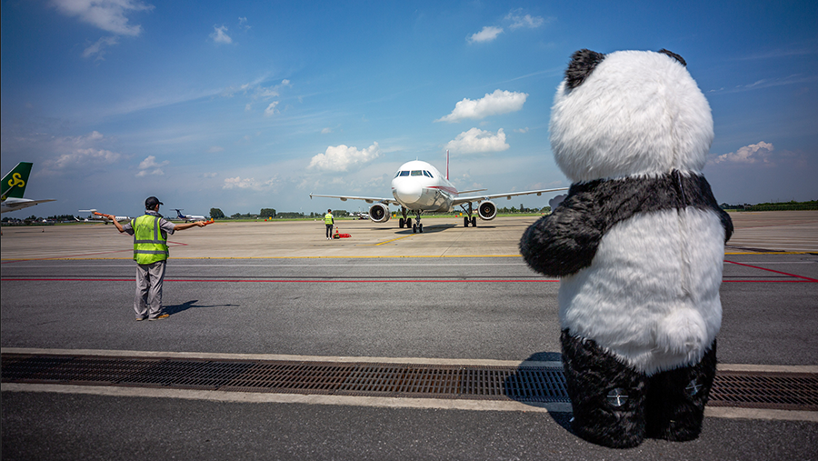 2020年8月5日,江苏扬州,工作人员在扬州泰州国际机场将大熊猫搬运出机舱。