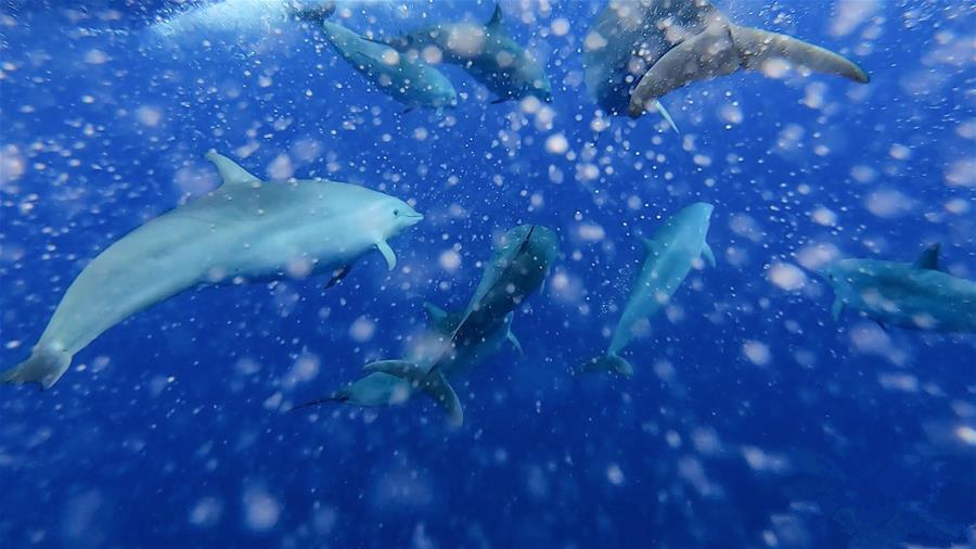 7月20日,我国科研人员在南海某海域目击并记录到短肢领航鲸群体与弗氏海豚群体混游现象。
