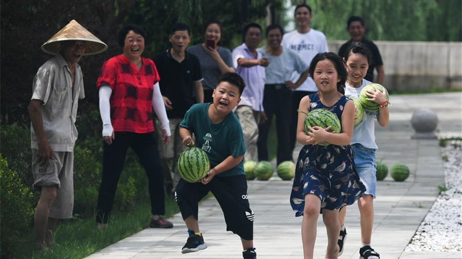 在江西鄱阳县五一中心学校安置点,村民帮助搬运供安置点村民食用的方便面,将刚刚收到的寝具铺在地上。