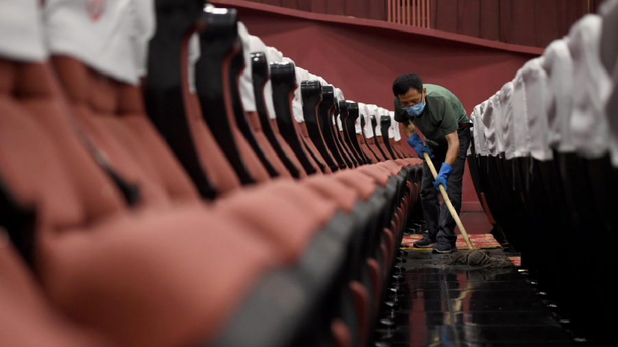 2020年7月23日,位于北京前门大栅栏的大观楼影院的工作人员在影厅内进行复映前的清扫工作。