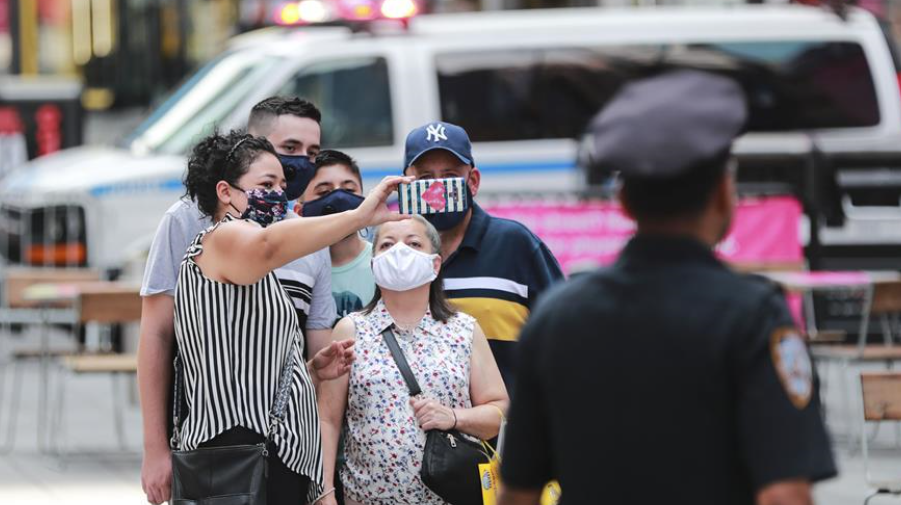 7月23日,人们戴着口罩在美国纽约时报广场拍照留念。