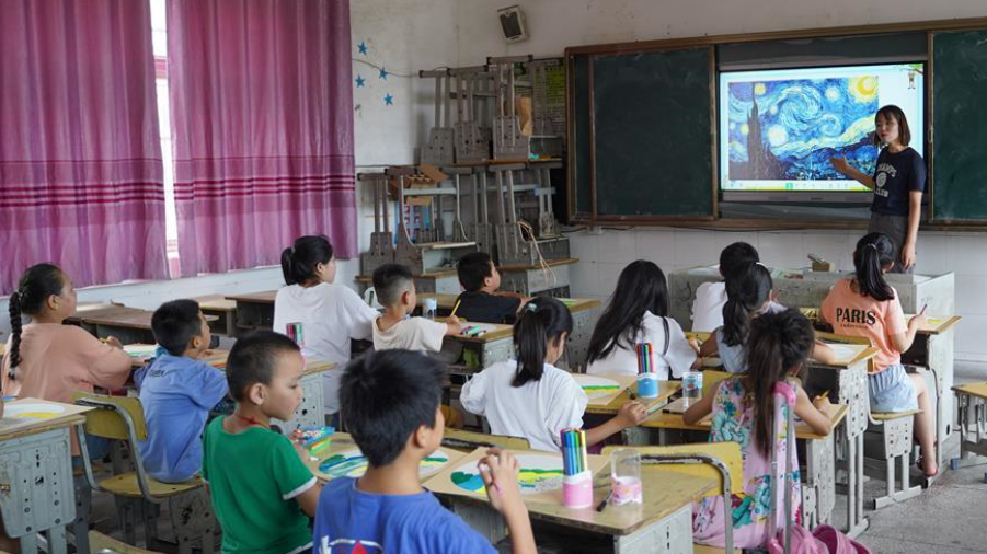 7月23日,在庐山市蛟塘镇中心小学安置点,小朋友在美术课上绘画。
