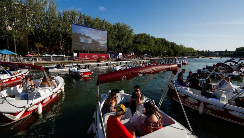 当地时间2020年7月18日,法国巴黎,当地民众来到河畔“水上电影院”观看电影。