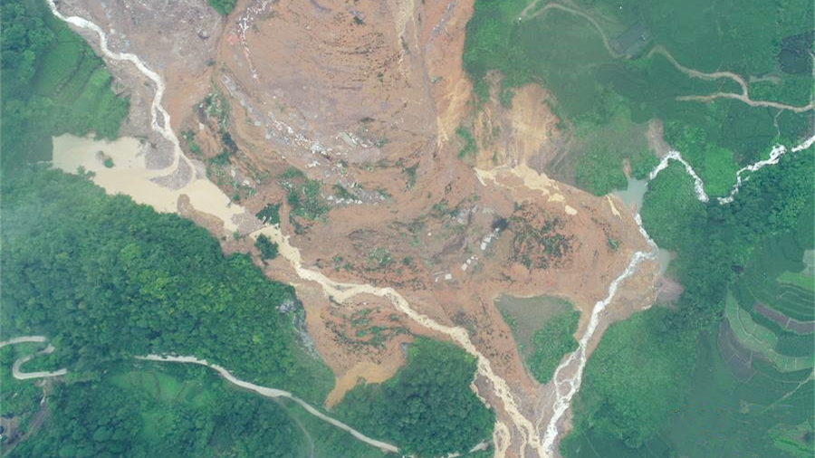 7月17日,一名地质勘查人员在湖南省石门县南北镇潘坪村雷家山滑坡现场查看灾情。