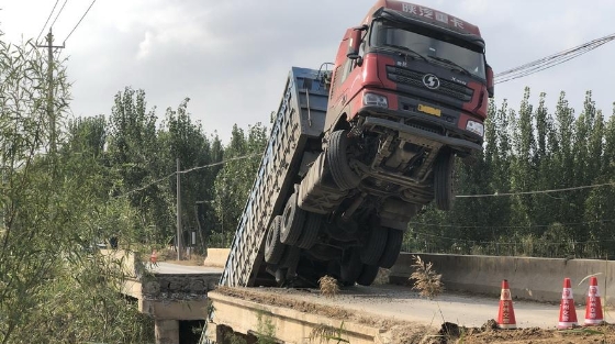 山东滨州,一辆满载货物的大货车路过当地一座宽4米左右的小桥时,致使桥面坍塌。
