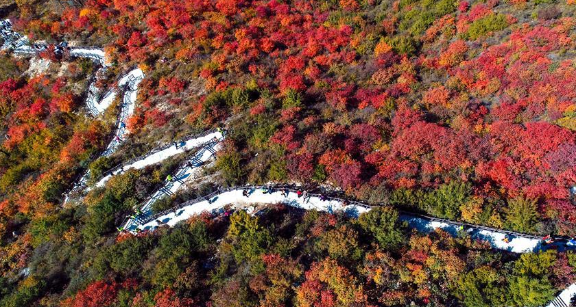 金秋十月,河北省涉县偏城镇太行红叶大峡谷的红叶进入观赏佳期,吸引众多游客前来登山赏景。