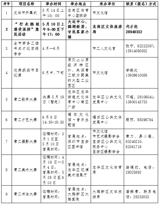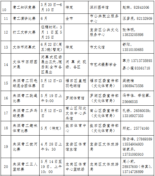 此外,在文体节期间,全市各级文化、体育部门还将广泛开展丰富多彩的文艺演出、比赛、展览、联谊、趣味体育、送书送戏送电影到工厂等活动,丰富文体节的内容,满足广大来深青工的文体生活需求。目前,全市劳务工读书成才巡回报告会、青工美术大赛已于本月启动将持续至6月,来深青工拔河比赛则将于4月28日在宝安体育馆开赛。