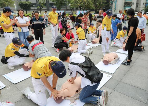 深圳市赛场救护队的专业人员在现场为莲花一村的社区居民普及了大众急救技能,并指导大家进行模拟心肺复苏的演练,中老年朋友则享受了免费的体质检测服务。