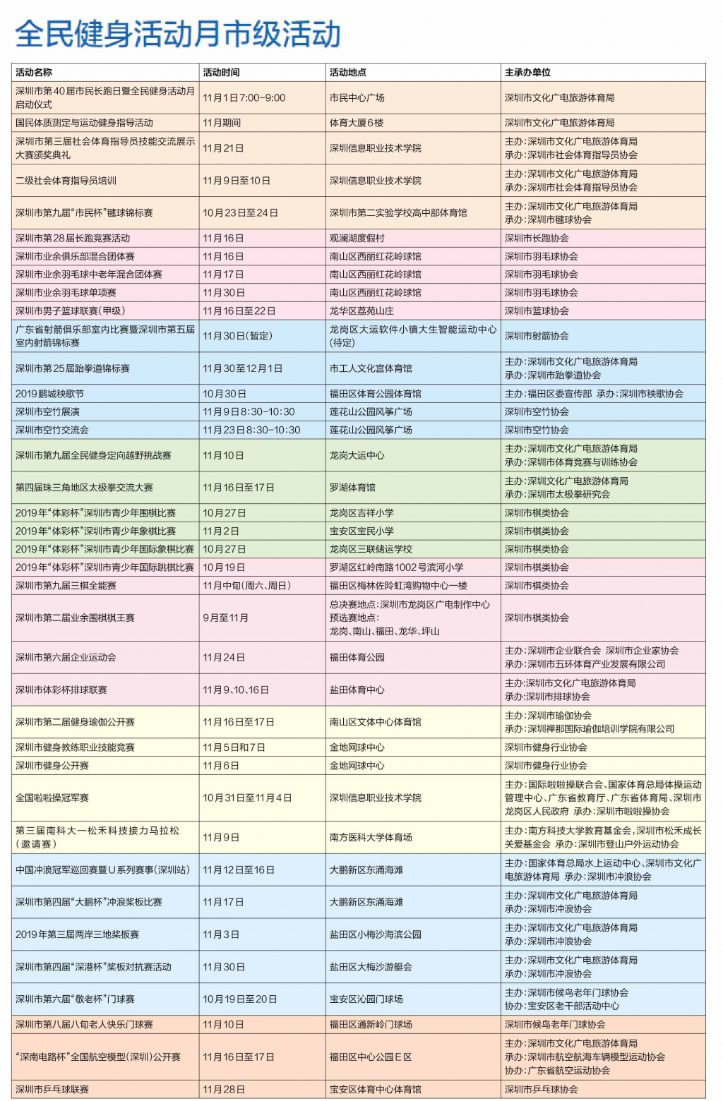 11月期间,深圳将举办37场市级活动,内容包括跑步、篮球、羽毛球、射箭、跆拳道、秧歌、定向越野赛、太极拳、排球、棋类等比赛以及国民体测与健身指导等系列活动。同时,全市各区、各单位也因地制宜地将举办百余场方便市民参与的全民健身活动,涵盖项目丰富多彩,最大限度地满足市民群众的健身需求。