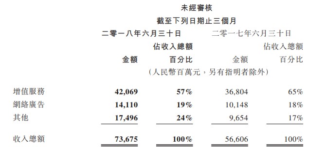 第二季度,增值服务收入为420.69亿元,同比增长14.3%,增速下滑29.02个百分比,收入占比57%,占比下滑8个百分点,利润率59%,同比下滑1.6个百分点。网络广告收入141.1亿元,同比增长39%,增速下滑16.4个百分点,收入占比19%,同比增加1个百分点,利润率37.4%,同比下滑0.4个百分点。