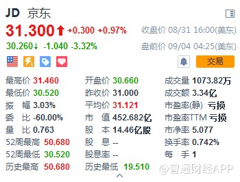 截至发稿,京东(JD)盘前跌3.32%,跌幅一度曾达4%。(林宥辰)