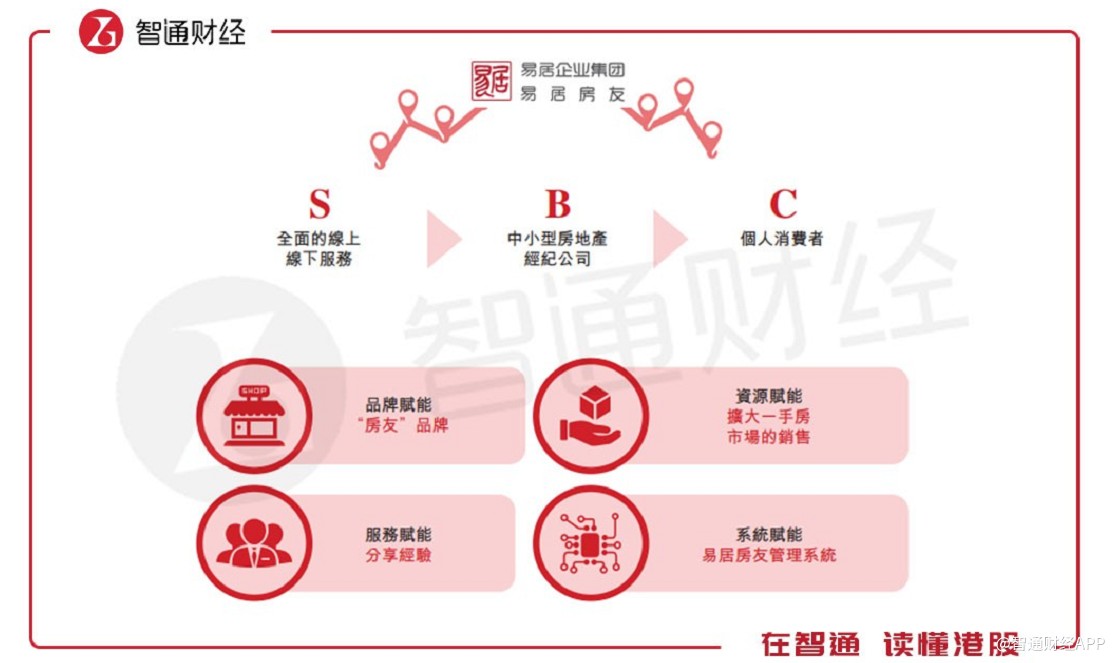 易居房友S2B2C的模式之新在于它不直接开展二手房经纪业务,也不开设二手房经纪公司,而是赋能并整合房友品牌下的中小微房地产经纪公司,向中小微房地产经纪公司(B)提供在线线下综合服务(S),以帮助其更好的服务个人客户(C)。
