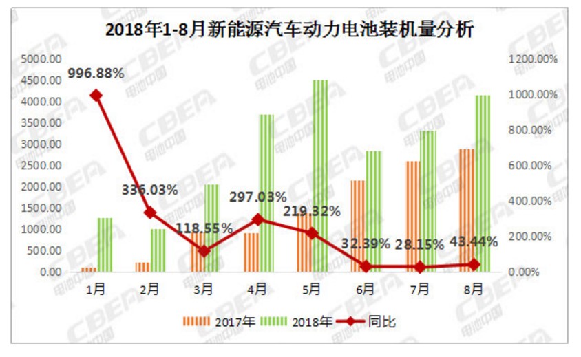 智通财经APP获悉,据动力电池应用分会研究部分析数据显示,2018年8月,我国新能源汽车动力电池装机量约4.17Gwh,环比增长25%,同比增长43.44%;1-8月累计装机总量约22.97Gwh。