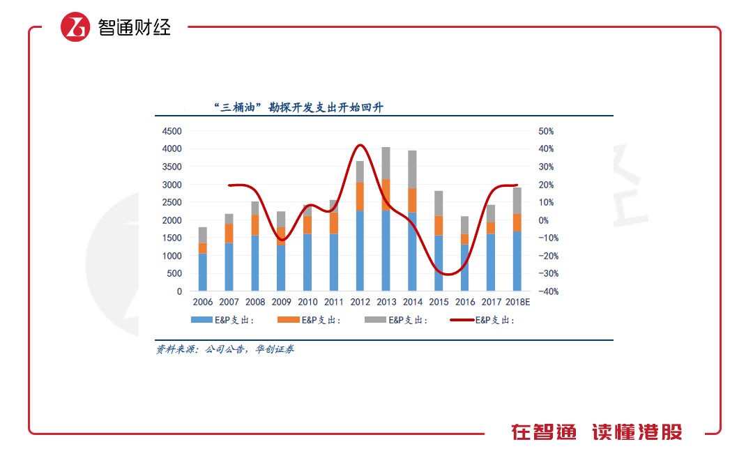 智通财经APP了解到,4年的行业低迷期,中石油、中石化、中海油合计用于勘探、开发的资本支出从2014年的3954亿元人民币(单位下同),下降至2016年的2112亿元,“三桶油”国内原油产量也从2014年的13.63亿桶下降至2017年的12.50亿桶。