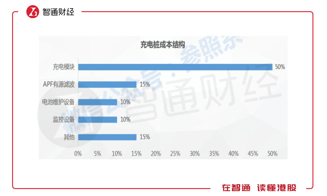 充电桩的上游是零部件的供应商,主要为电池维护设备、充电模块、监控设备等,而充电桩的成本构成中,充电模块占比达50%,充电模块、监控设备及电池维护设备合计成本占比达到70%,是充电桩的核心成本。