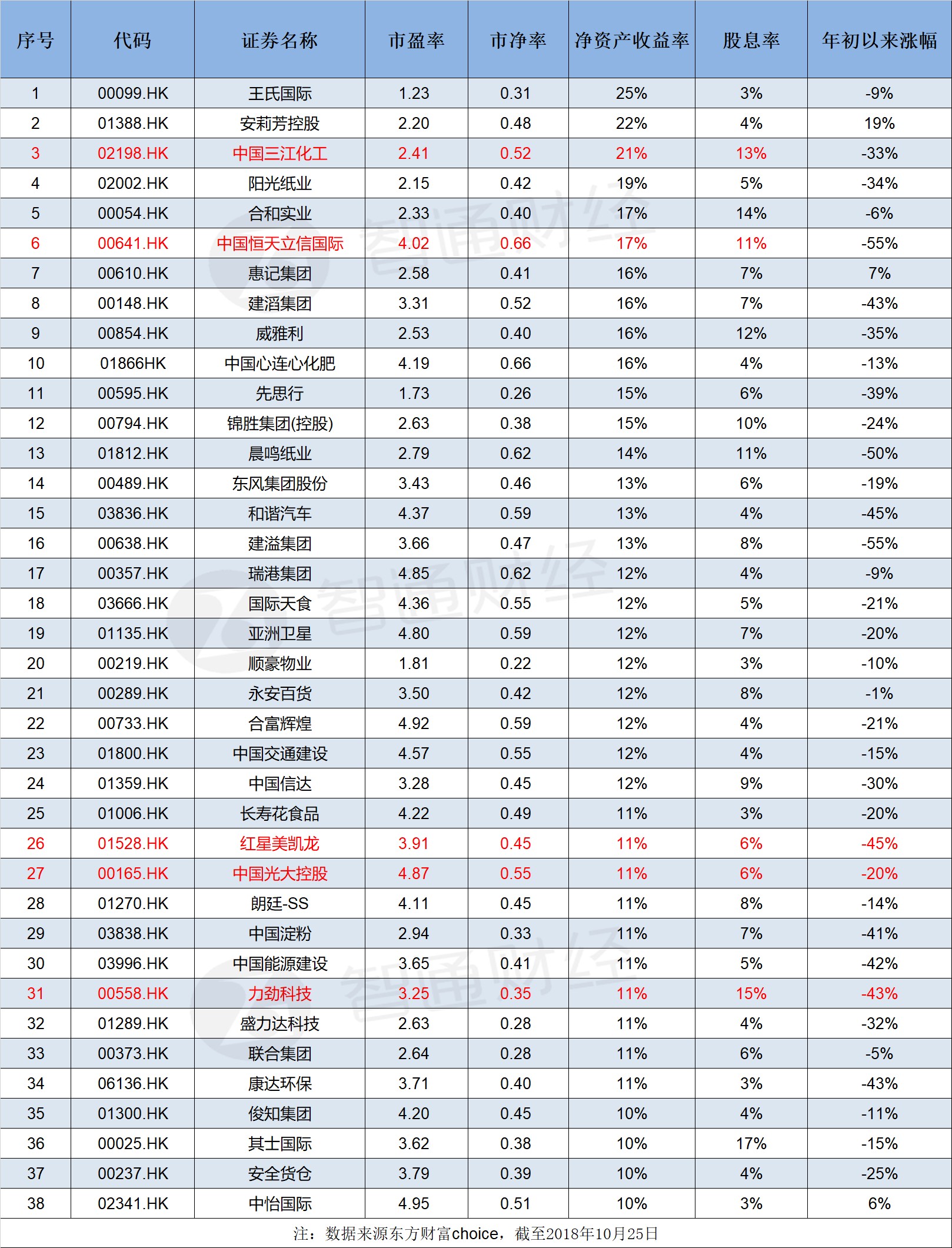 图表显示,截止2018年10月25日,从ROE指标来看,指标比较居前的公司有安莉芳(01388)、中国三江化工(02198)、合和实业(00054)。其中,中国三江化工为ROE及股息率双高个股。