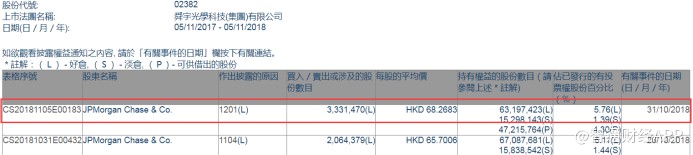 智通财经APP获悉,根据联交所资料显示,摩根大通于10月31日减持舜宇光学科技(02382)333万股,每股作价约68.27港元,总值2.27亿港元,最新持股量减至5.76%。