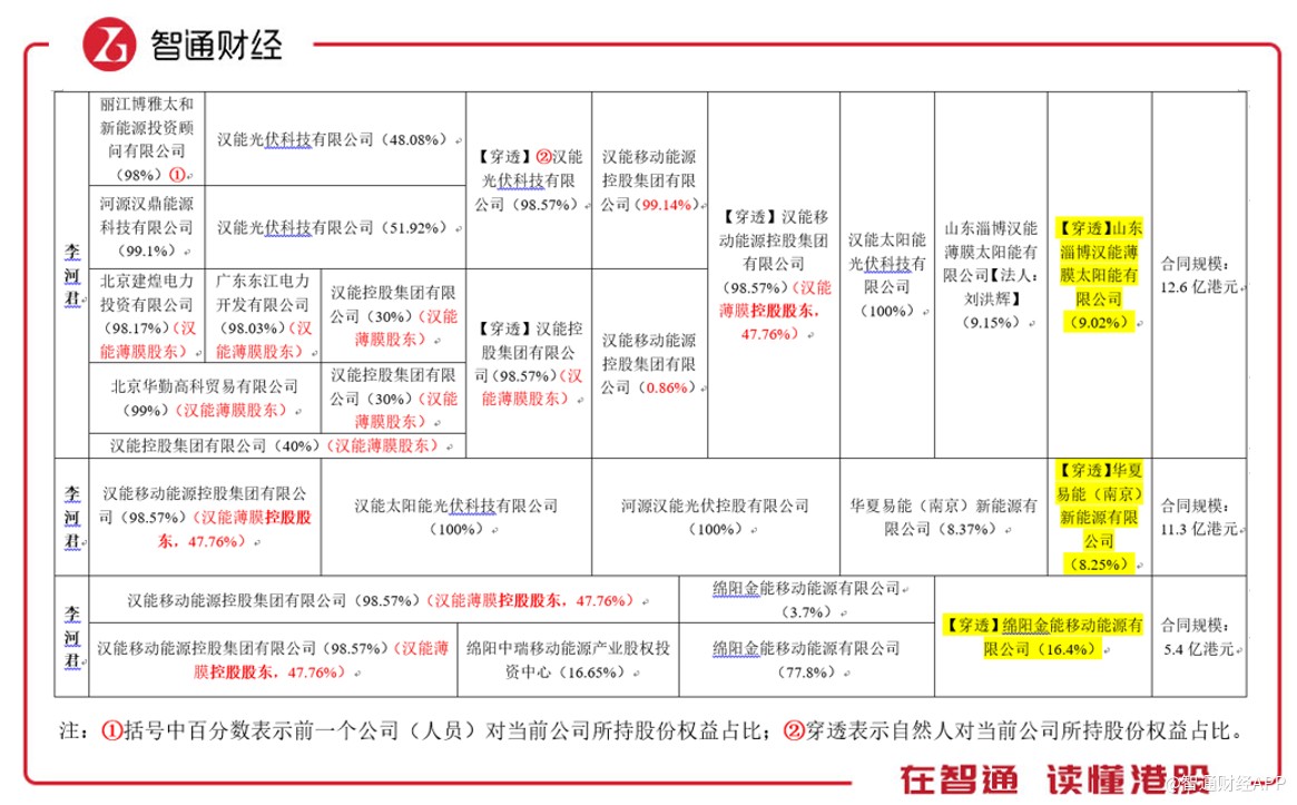 汉能移动又通过持股其它公司,间接持有山东淄博汉能薄膜太阳能有限公司(淄博汉能)9.15%股权,穿透股权发现李河君持有淄博汉能9.02%股权。