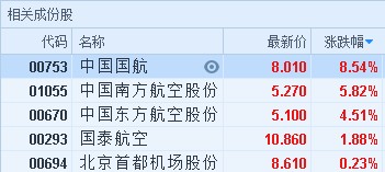 智通财经APP获悉,受益于国际原油价格下挫,航空股全线大涨。截至9时20分,中国国航(00753)涨8.54%,报价8.01港元,南方航空(01055)涨5.82%,报5.27港元,东方航空(00670)涨4.51%,报5.1港元,国泰航空(00293)涨1.88%,首都机场(00694)涨0.23%。