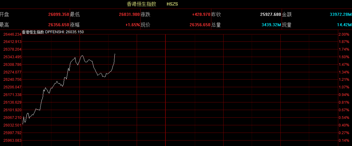 智通财经APP获悉,恒生指数开盘涨0.66%,报26099.35点。国企指数涨0.63%,报10453.82点。红筹指数涨0.48%,报4281.96点。大市盘前成交11.68亿港元。