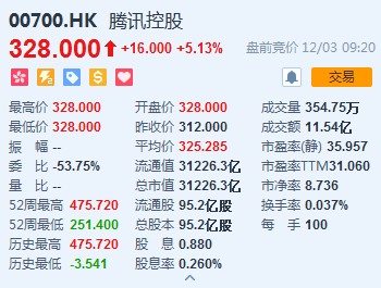 蓝筹方面,腾讯(00700)早盘涨5.13%,报328港元,大市盘前成交额为11.54亿港元。其他重磅蓝筹方面,瑞声科技(02018)涨5.95%,报58.75港元,中海油(00883)涨5.86%,报14.08港元,中石油(00386)涨4.92%,报5.76港元,中石化(00386)涨3.76%,报6.9港元。