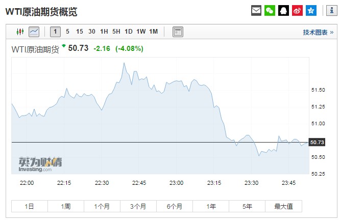 截至发稿,WTI原油跌4.08%报50.73美元/桶。