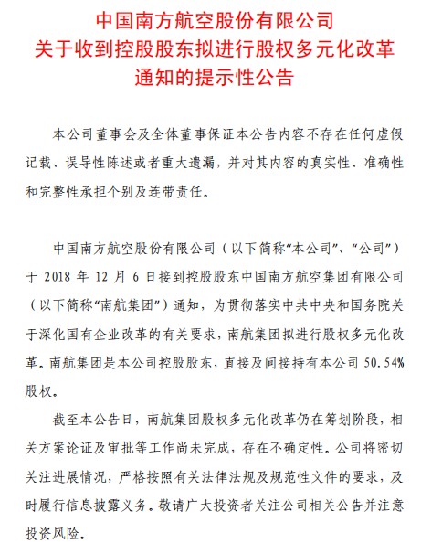 公告中称,中国南方航空股份有限公司于2018年12月6日接到控股股东中国南方航空集团有限公司通知,为贯彻落实中共中央和国务院关于深化国有企业改革的有关要求,南航集团拟进行股权多元化改革。南航集团是本公司控股股东,直接及间接持有本公司50.54%股权。截至本公告日,南航集团股权多元化改革仍在筹划阶段,相关方案论证及审批等工作尚未完成,存在不确定性。公司将密切关注进展情况,严格按照有关法律法规及规范性文件的要求,及时履行信息披露义务。(文文)