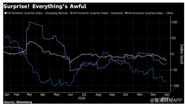 两位分析师表示,欧洲和新兴市场的经济惊喜指数均陷入负值区间。而标普500指数成份股公司约有三分之一的营收来自海外,海外市场的进一步疲软可能最终会令美国国内的增长前景变得黯淡。此外,美国国内的经济增长前景在一定程度上也已经因美国政府部分关门而减弱。
