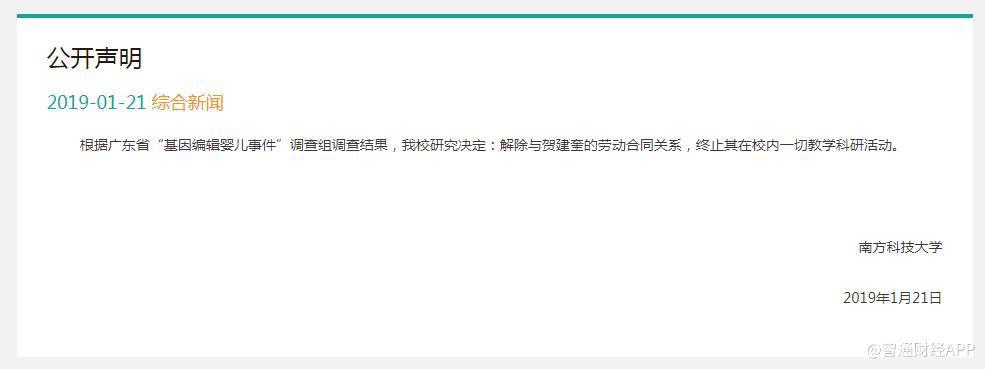 1月21日,南方科技大学发出公告称,根据广东省“基因编辑婴儿事件”调查组调查结果,我校研究决定:解除与贺建奎的劳动合同关系,终止其在校内一切教学科研活动。