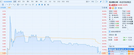 智通财经APP获悉,1月10日停牌的前进控股集团(01499)于24日复牌,股市反响剧烈,开盘十分钟曾一度暴涨74.56%,不过随后不断滑落,截止16时45分,报港元0.425元(下同),较停牌日收盘价0.39元仅有9%的增幅。