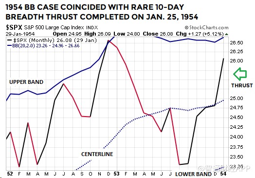 1954年1月最后一个交易日结束后,当时的布林通道月线图与2019年1月末时的极为相似: