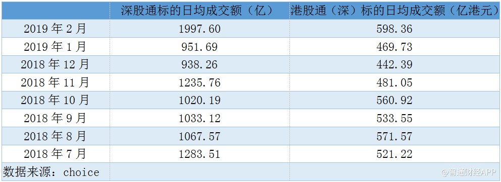 伴随着股市上涨的,是两地资本互通的热度。据智通财经APP统计,北上资金方面,2019年2月,沪(深)股通标的日均成交额分别为1663.55亿、1997.6亿;南下资金方面,沪(深)港股通日均成交额分别为556.31亿、598.36亿,均相较于其他月份显著放大。