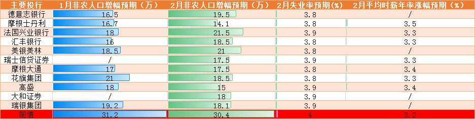但是,根据智通财经APP整理出的11家大型投行的非农预测显示,相对于1月非农就业人口大增30.4万而言,各投行对于美国2月非农就业人口增幅的预期不太乐观。整体来看,华尔街对美国2月季调后非农就业人口增幅预测介于14.1万-21.5万之间,失业率预测介于3.8%-3.9%之间,平均时薪年率增幅预测介于3.3%-3.5%之间。