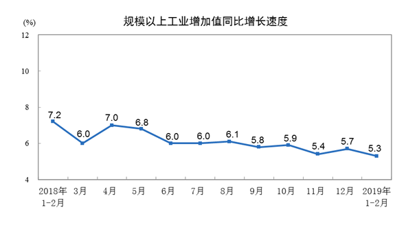 智通财经APP获悉,国家统计局今日公布,2019年1-2月份,规模以上工业增加值同比实际增长5.3%(以下增加值增速均为扣除价格因素的实际增长率),预期增长5.6%,前值为6.2%。据测算,剔除春节因素影响增长6.1%。从环比看,2月份,规模以上工业增加值比上月增长0.43%。